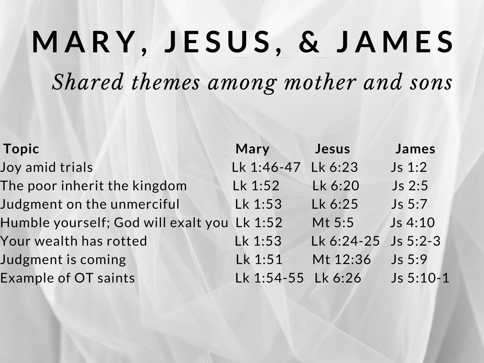 Even with just ten verses from Mary and one short letter by James to analyze, we see the family resemblance. We could draw similarities from Paul's themes across his whole corpus, but we would be drawing from a much larger sample size amid many more themes. The similarity of themes between Mary, Jesus, and James (compared with the proportionally lesser density of these themes in Paul and other epistle writers) shows the influence of this mother upon her sons. If you had been an acquaintance of Mary in her young adult life and stumbled upon Jesus and James decades later, you wouldn’t have had to converse with them long before you knew whose children they were. They were Mary’s boys.