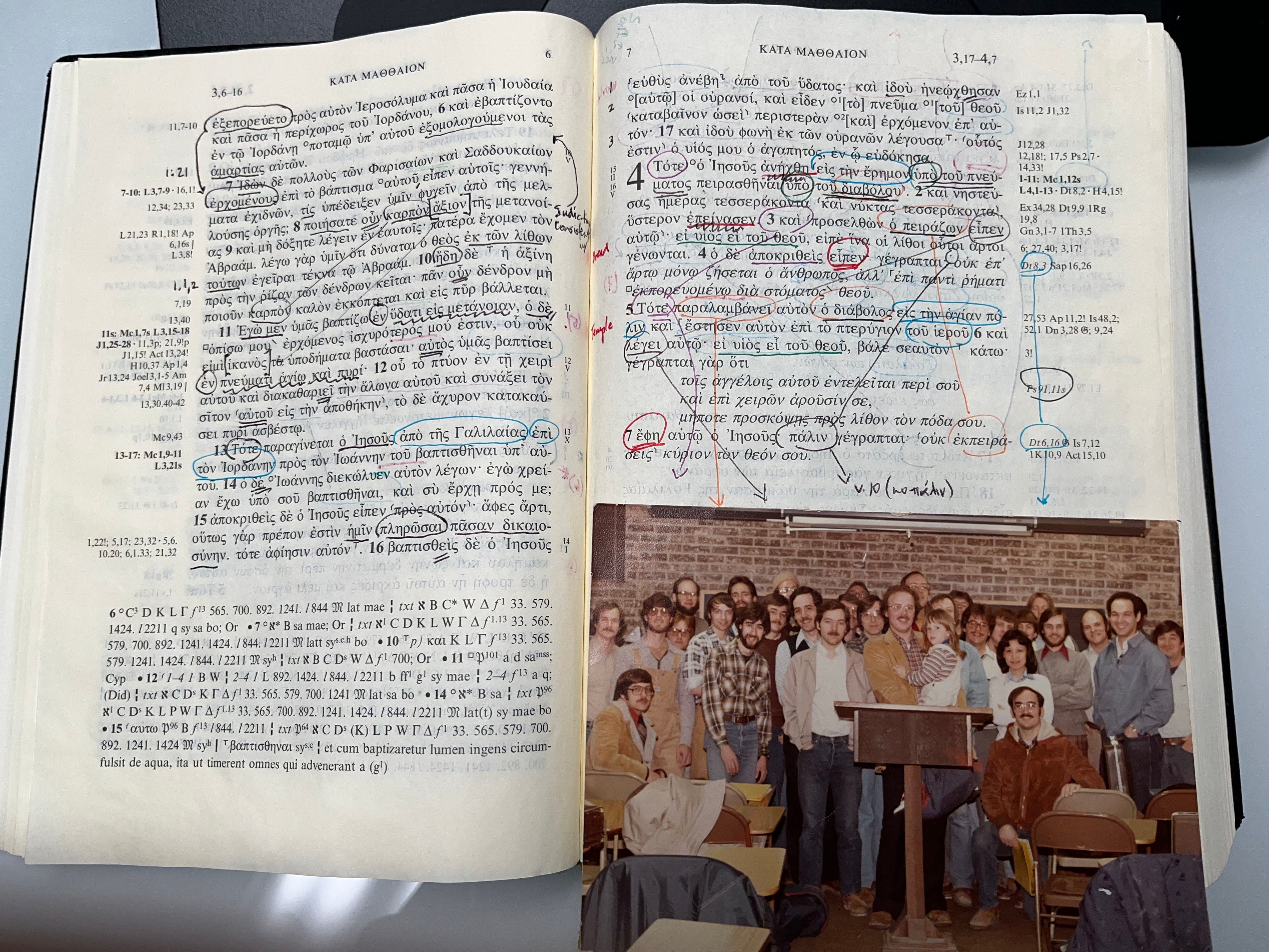 The first seminary class I taught was a Greek Exegesis class at TEDS, and it was a two-semester course (Exegesis I & II). Fall 1980-Winter 1981. The seminary was kind enough to give me a small office next to the water fountain and bathrooms in the Peterson wing. I don’t recall the days for teaching, but I’m thinking it was Tuesday and Thursday. I still have a picture of the class. Every now and then I open my Moleskine, and there the students are! I’m glad I wrote their names on the back. Every now and then, mostly then, I get a note from one of them. They are, I’m sure, as surprised of me as I am of them.